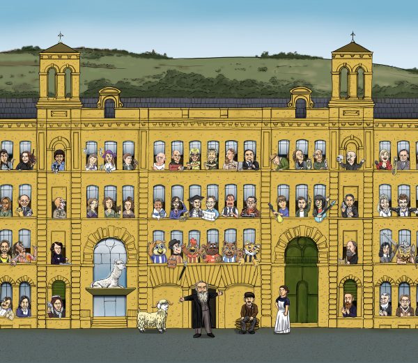 Limited edition prints of Salts Mill featuring 219 famous Yorkshire faces from all walks of life.