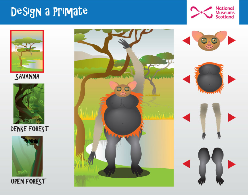 Museums Scotland Design a Primate • National Museums Scotland Illustrations commissioned by National Museums Scotland for an interactive where visitors could design their own primates.